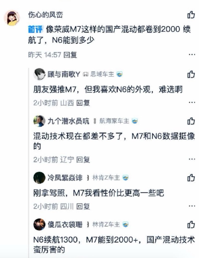 比如其举例的截图中显示的评论:“救命,老婆要买N6,我要买荣威M7。”“不知道N6的沙发咋样,荣威M7的座椅我试了试真不错哈。”“前有荣威M7打样,后有N6跟进,10万预算国产还是合资呢?”“N6参数和荣威也太像了,英雄所见略同?”“N6续航1300,M7能到2000+,国产混动技术蛮厉害的。”