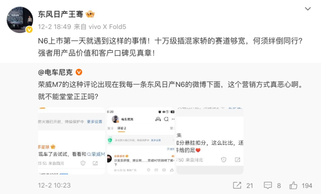 当天下午,东风日产新能源品牌总经理王骞就转发了一位汽车博主的微博,并表示:“N6上市第一天就遇到这样的事情!十万级插混家轿的赛道够宽,何须绊倒同行?强者用产品价值和客户口碑见真章!”在该条微博下,不少网友吐槽荣威的营销方式。