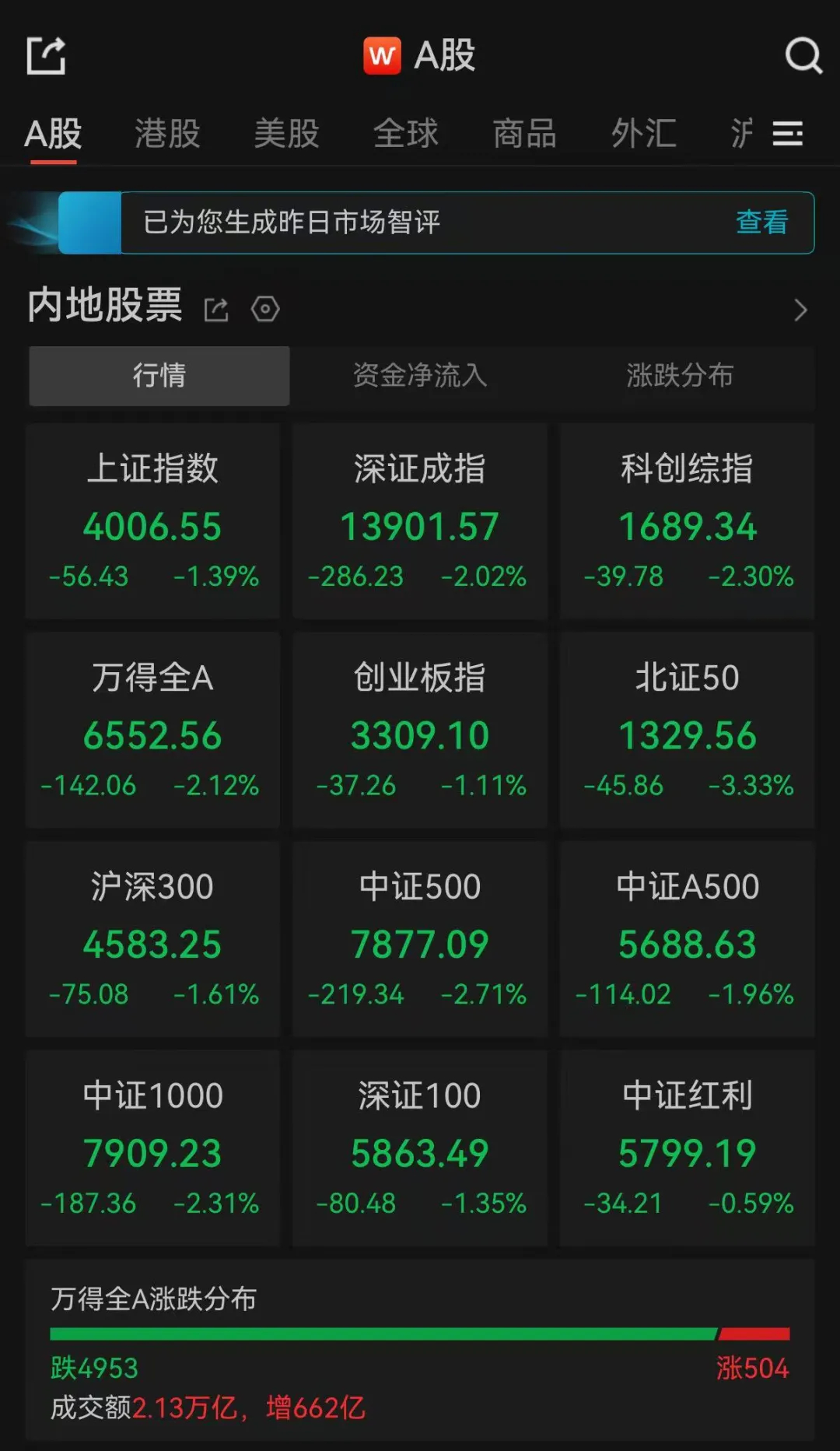 19日,A股三大指数低开,随后震荡下行,沪指盘中一度跌破4000点。截至收盘,沪指跌1.39%,险守4000点;深证成指跌2.02%,创业板指跌1.11%。